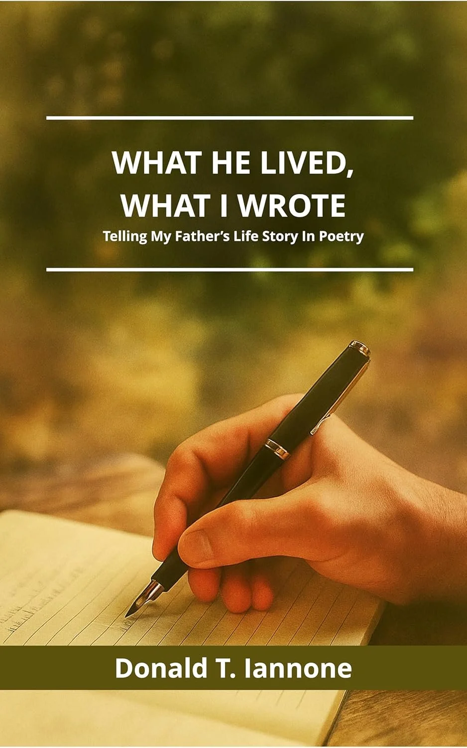 What He Lived, What I Wrote is an intimate memoir in verse that explores a working man’s life through the reflective lens of his son. Blending personal memory, imagined voice, and poetic craft, Don Iannone honors his father, Donald Lowell Iannone—an Ohio Valley mechanic, Navy veteran, husband, and quiet poet—whose life was shaped more by action than speech. Each chapter pairs the father’s own poems with the son’s lyrical responses, creating a dialogue across generations.